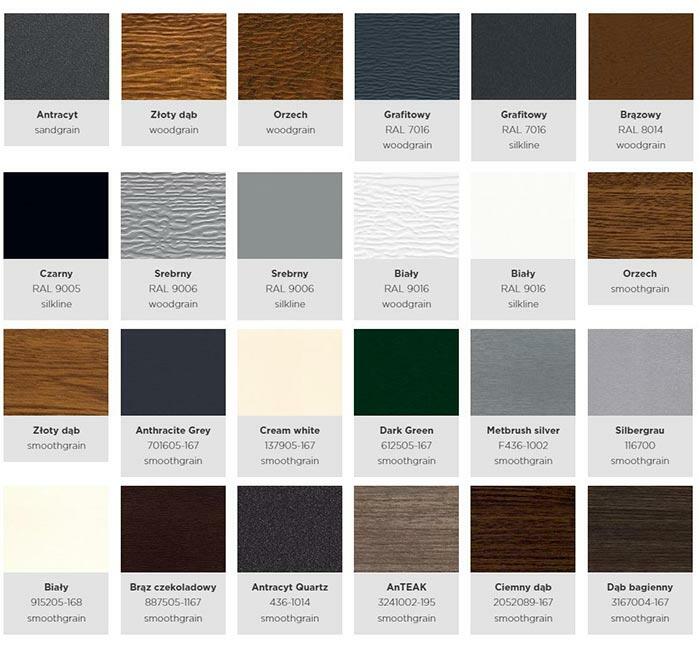 - Dekory drewnopodobne: złoty dąb, orzech, mahoń, antracyt i wiele innych.