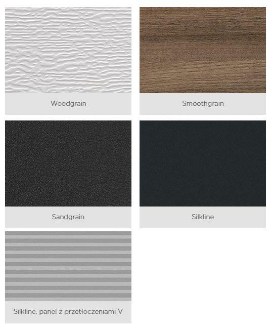 - Nowoczesne struktury powierzchni: woodgrain, stucco, gładka, mikroprofil, oraz stal szlachetna.
